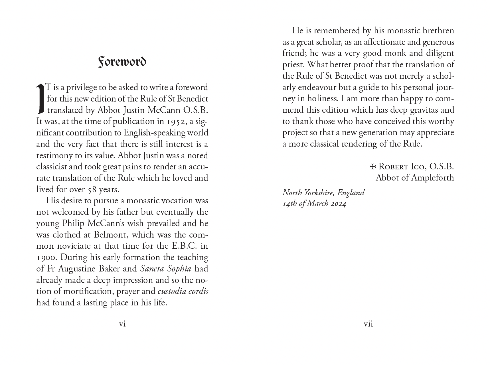 This new edition promises to be a welcome representation of McCann’s beautiful rendering of Benedict’s Rule, as well as McCann’s own insights into the Rule’s teaching on monastic life. I pray that it will be for you a source of joy and inspiration.’