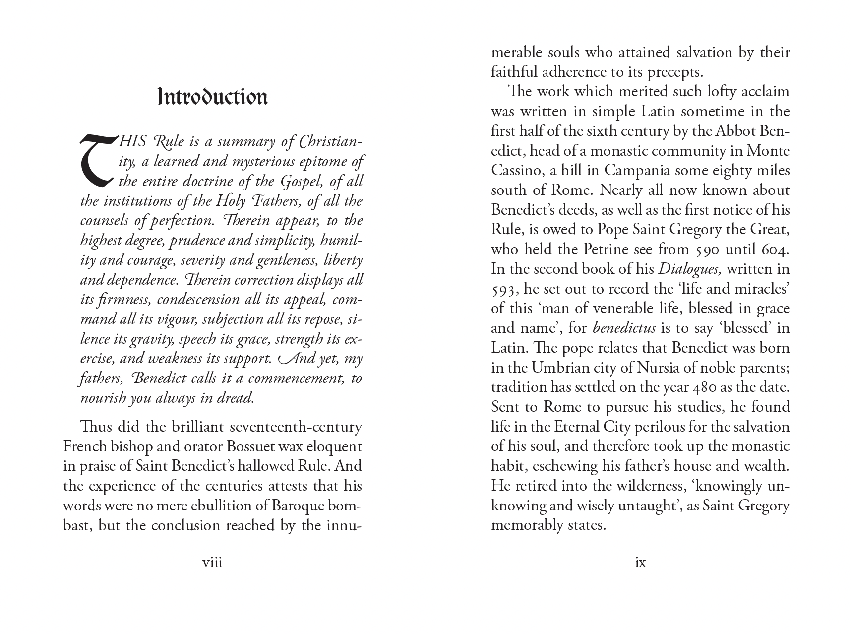No book apart from the Bible was more copied in the Middle Ages than the venerable Rule of Saint Benedict, which has guided uncounted monks, nuns, oblates, and laymen to salvation for well over a millennium since it was written in the sixth century. Originating in rural Italy, its evident wisdom and simple style recommended it to Pope Saint Gregory the Great, and honoured by his approval it soon spread throughout Latin Christendom, becoming the monastic rule par excellence.