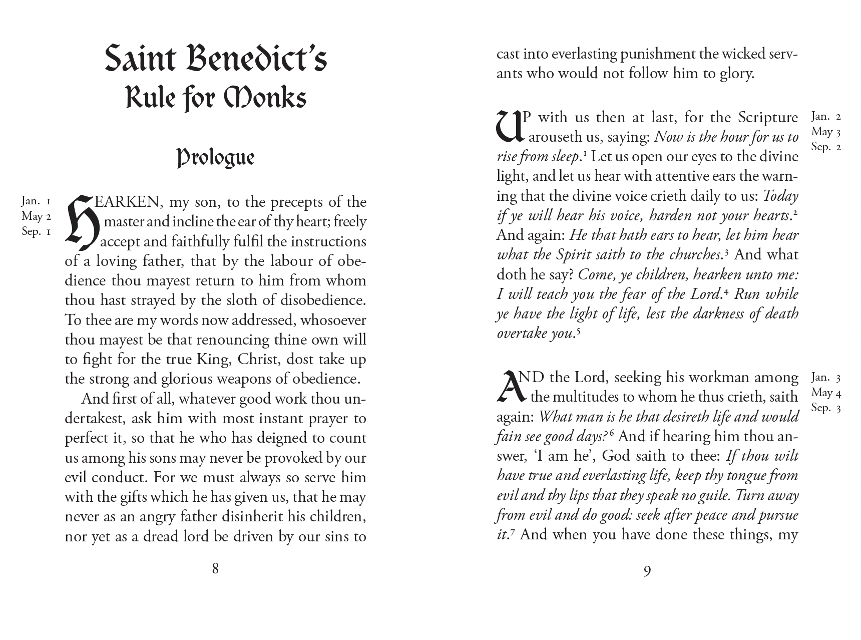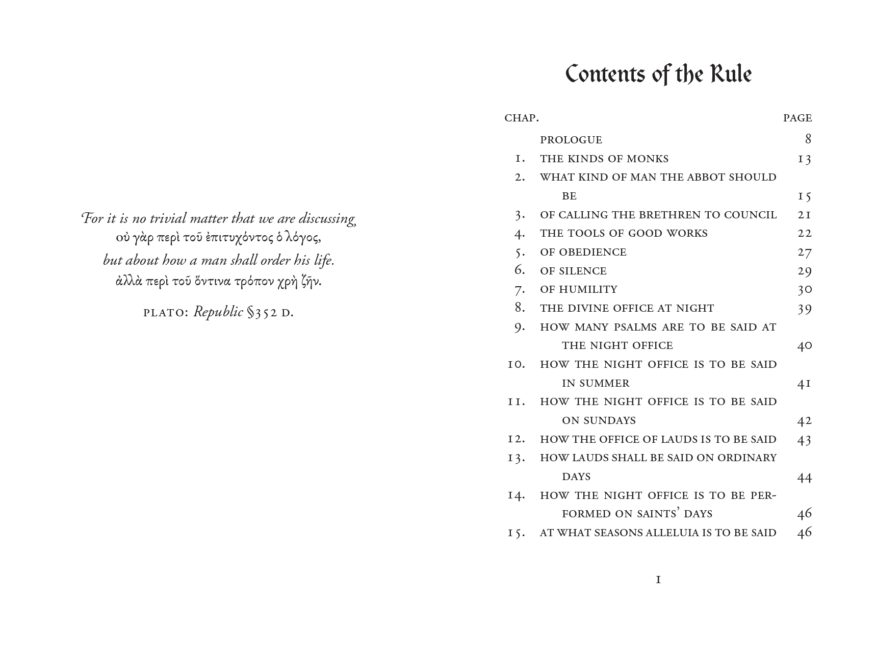 Dom Justin McCann's translation of the Rule was first published in 1937, and has long been admired for its happy combination of elegance of style and accuracy. Having fallen out of print for decades, it is here finally republished in a newly typeset edition with historically correct monastic typeface. The dates on the margins mark the passages traditionally read at the Chapter Office after Prime that ensure the Rule is read in full three times a year, while the edition's pocket size (4 × 6 in.) makes it convenient for personal study and reflection as well. English-speaking readers here have an enduring companion as they 'gird their loins with faith and the performance of good works, and following the guidance of the Gospels walk in the Lord's paths, that they might merit to see him who has called us unto his kingdom'.